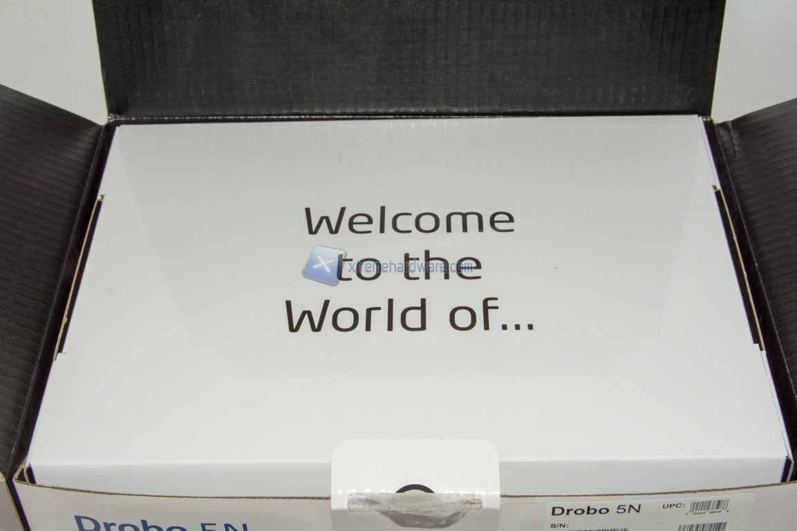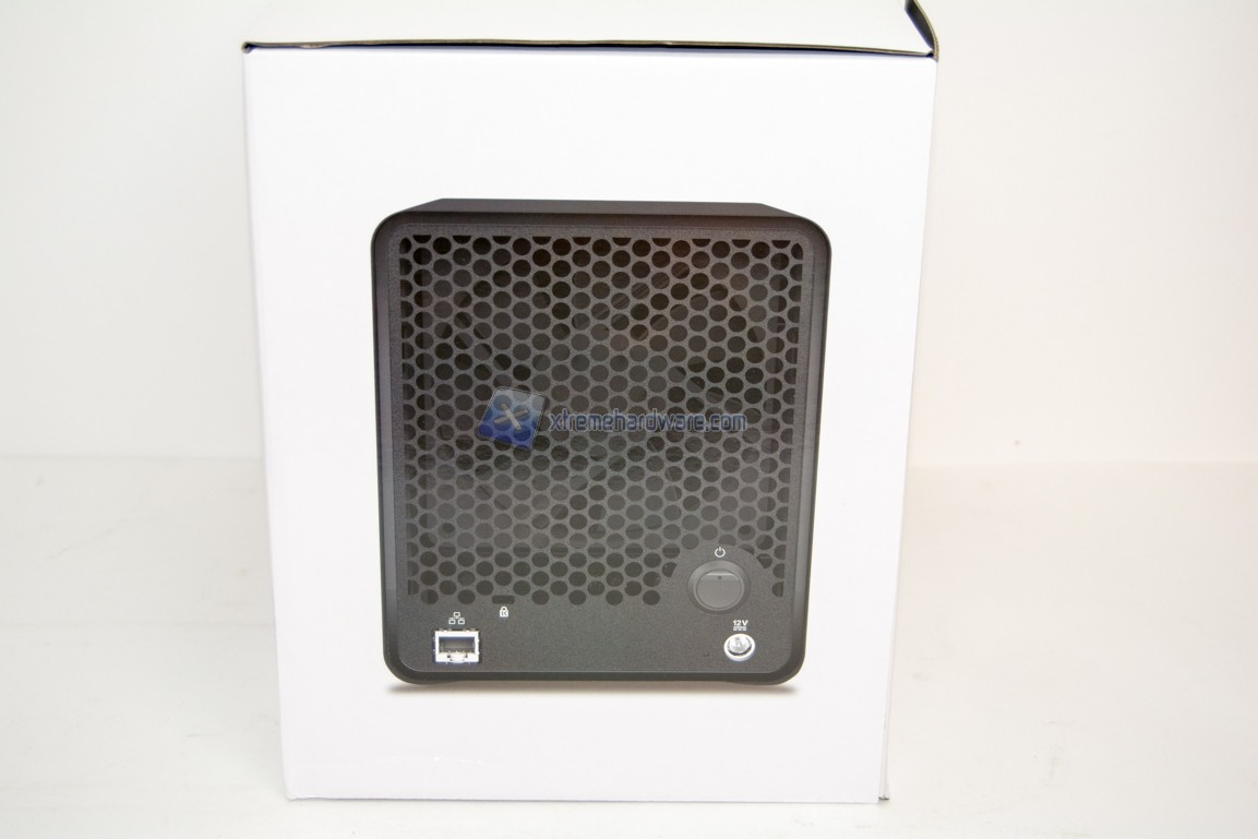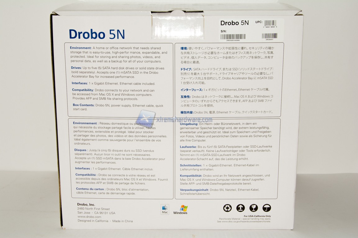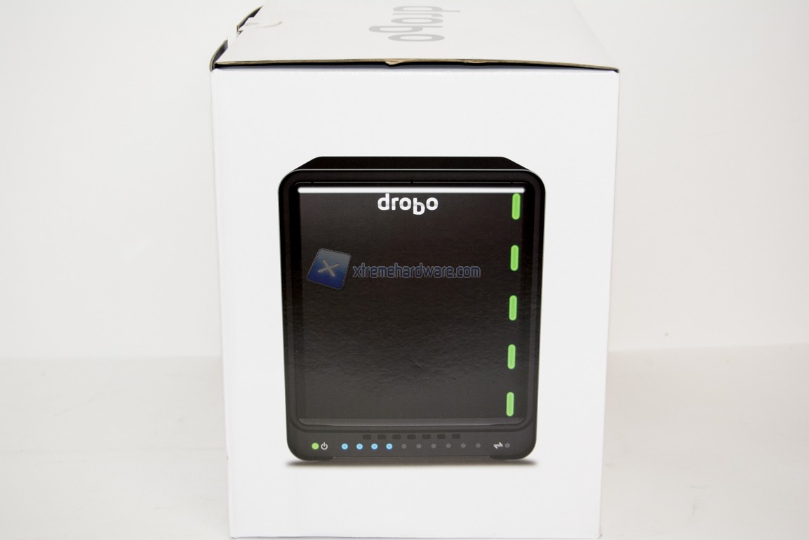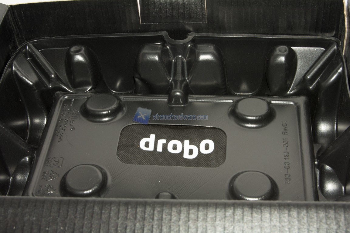 Il Drobo 5N è venduto all’interno di una confezione di cartone lucido completamente bianca e riportante alcune semplici ma chiare informazioni.