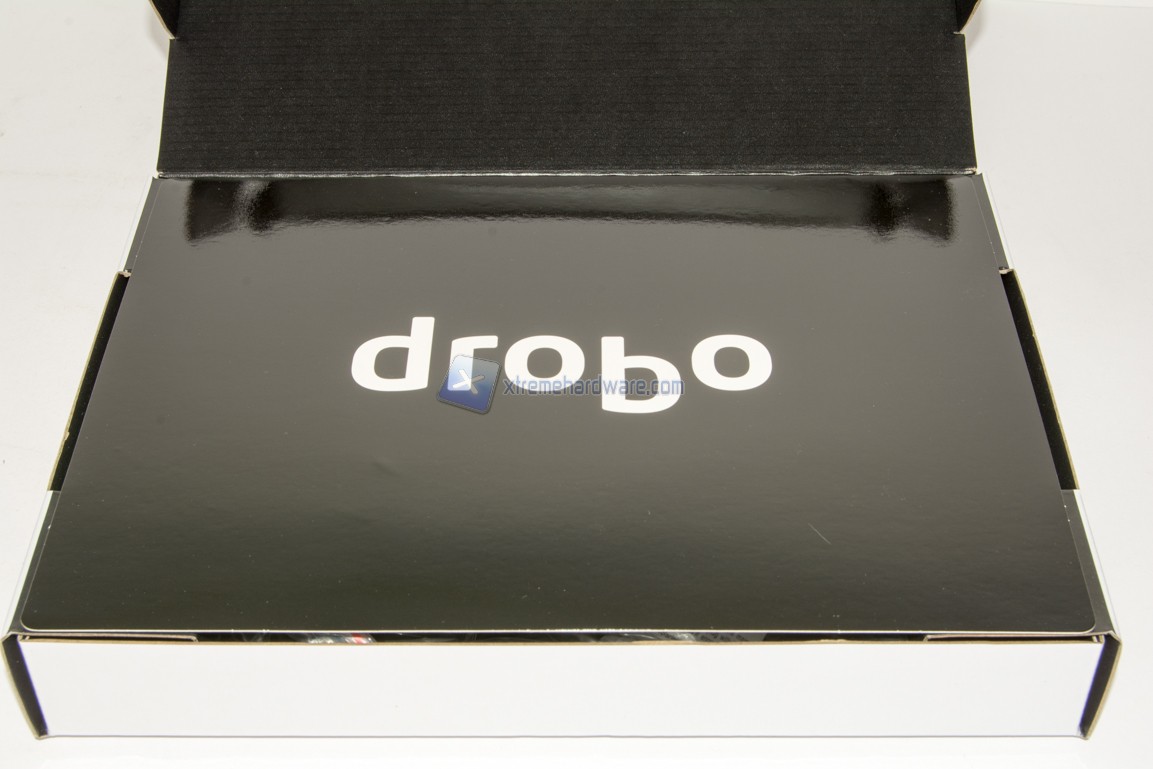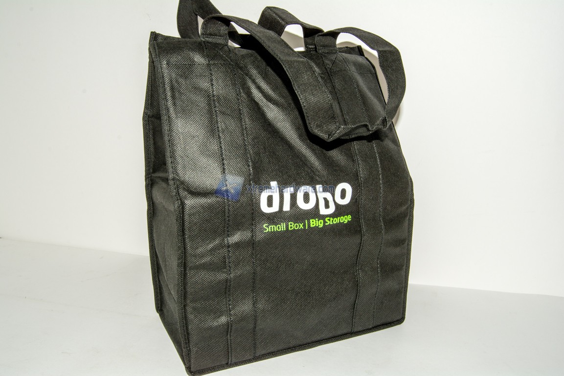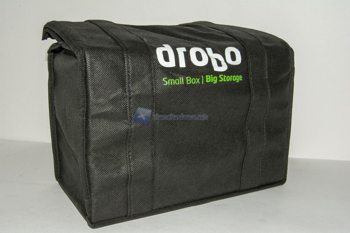 Alzando il coperchio, infatti, ci troveremo di fronte alla classica scatola in cartone contenete gli accessori e ad una borsa in tessuto riportante il logo Drobo e contenente il NAS stesso; stupenda.