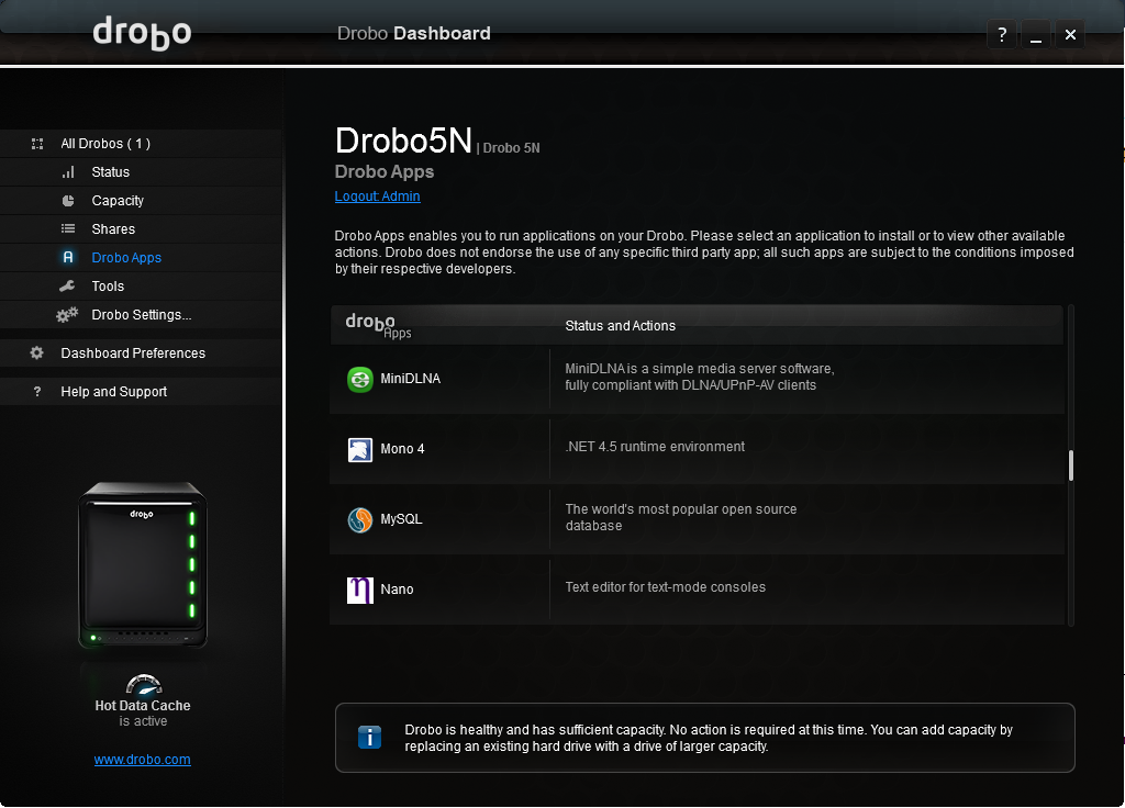 “Drobo Apps” racchiude una delle caratteristiche più importanti relative a questo software; la possibilità di installare numerosi utility ed applicazioni da utilizzare con questo prodotto, esattamente come avviene per Synology, QNAP o Asustor, ad esempio.